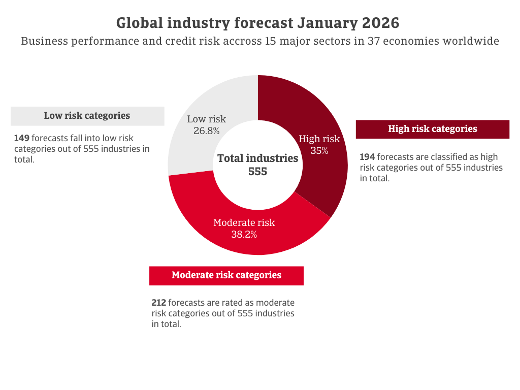 In total, 555 forecasts have been issued: 149 fall into low risk categories, 212 are rated as moderate risk, and a significant segment of 194 is classified as high risk. Forecasts for food, pharmaceuticals, financial services, chemicals, electronics/ICT, and agriculture are more favourable than the overall benchmark. Machines/engineering and services remain at mid-range risk levels. Transport, automotive, consumer durables, and paper show elevated risk. The most negative outlook is concentrated in construction, metals/steel, and textiles.