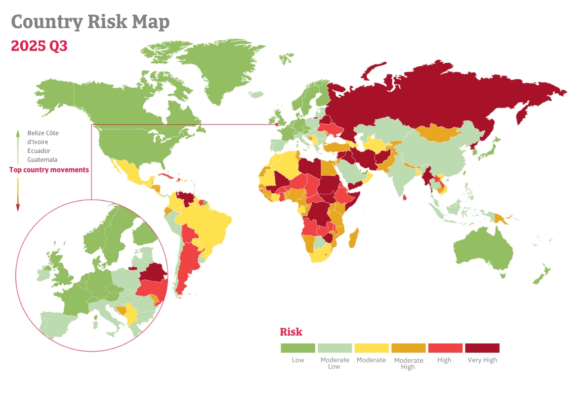 The latest Country Risk Map update provides an overview of risk levels across more than 200 countries and territories. Of these, 76 fall into the low-risk categories, and 27 into moderate risk. The largest segment comprises 104 countries rated at high-risk levels. This assessment serves as a reminder that risk remains widespread and helps businesses stay aware, understand, and manage the challenges of international trade.