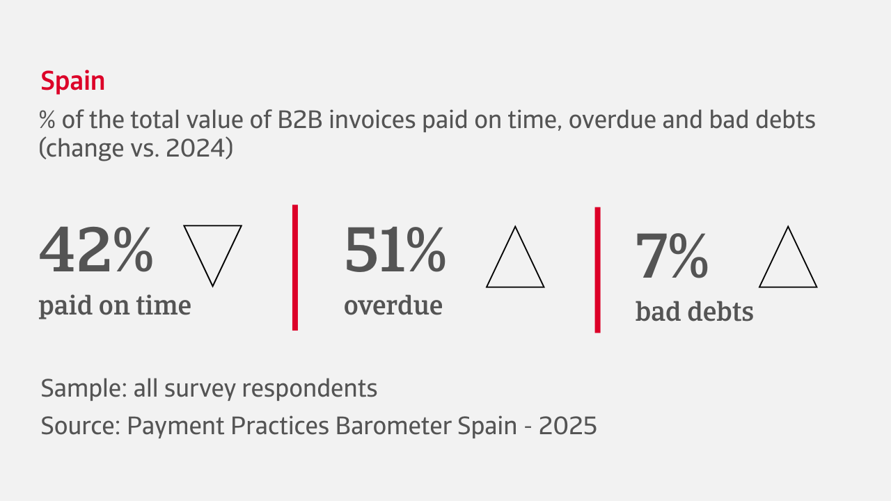 • Most Spanish companies report no improvement in B2B customer payment patterns compared to last year, indicating ongoing financial instability among customers