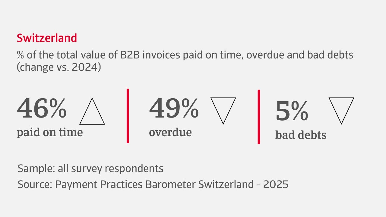 • Companies in Switzerland report ongoing challenges with cash inflows related to B2B trade due to significant impact of delayed payments.