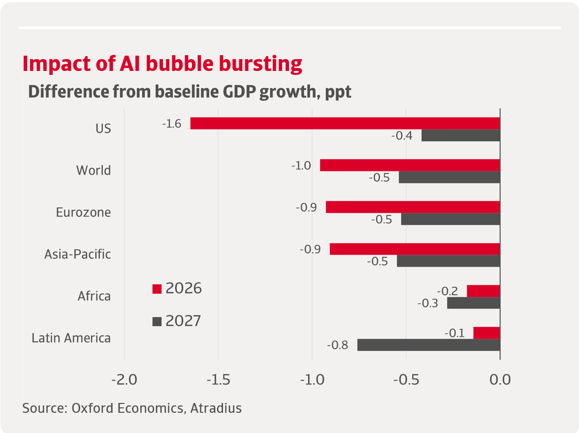 • Risks remain high: a sharp drop in AI confidence could trigger a global downturn, with the US and Asia-Pacific the most exposed