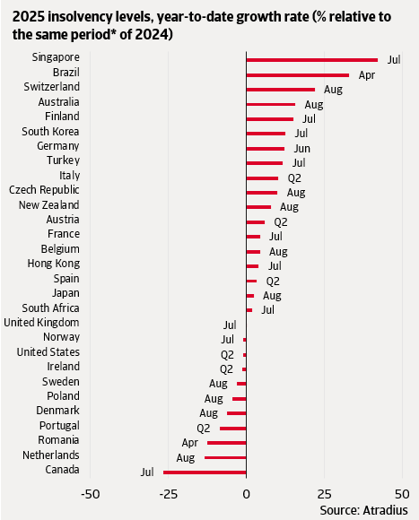 A minority of markets, however, show little change or declines, highlighting resilience despite global headwinds. In the United States, the number of insolvencies remained virtually unchanged, despite pressure from rising tariffs. The negative impact of the tariffs was absorbed in the short term by companies increasing their inventories in anticipation of the tariffs’ implementation. In the United Kingdom, insolvencies also stayed stable, but at levels above pre-pandemic, reflecting a more difficult environment for businesses after Brexit.
