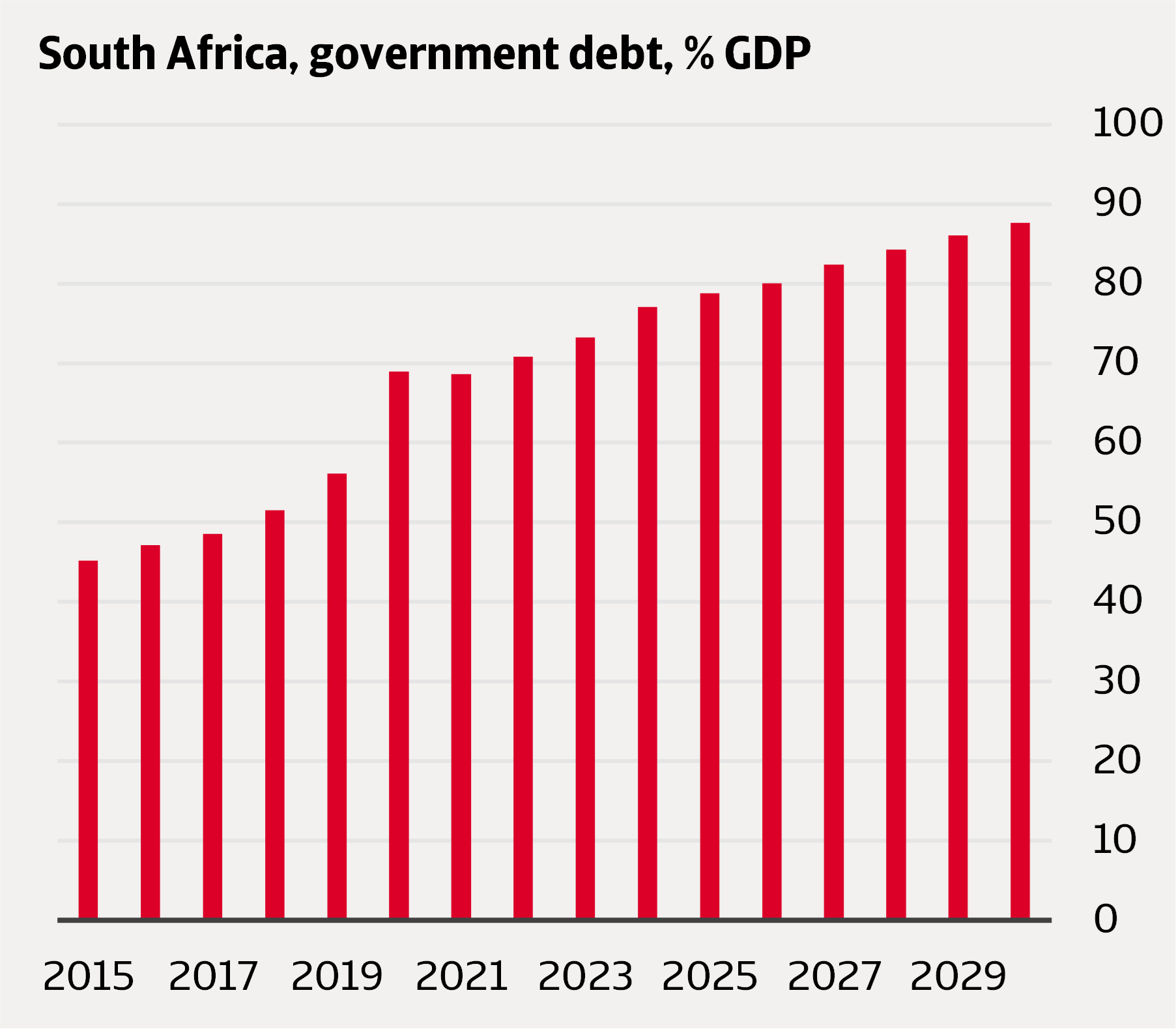 Over recent years, South Africa showed persistently high budget deficits, leading to a sharp increase in public debt. In 2024, total public debt reached 77.3% of GDP, up from 45.2% in 2015. It is expected that public debt will remain elevated. Although the GNU is committed to fiscal consolidation and maintaining debt sustainability, the debt-to-GDP ratio is expected to deteriorate slightly in the coming years. This is not due to rising nominal debt, but because of low economic growth.