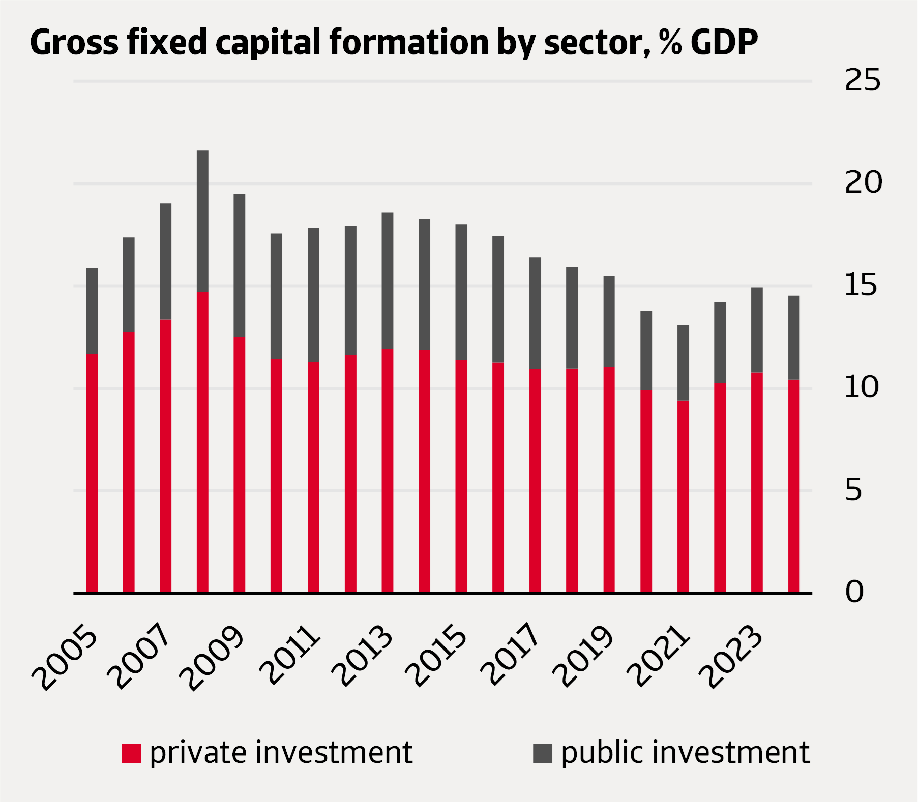 Capital investment in South Africa has been low for years.  In 2024, investments were only 14.5% of GDP, insufficient to accelerate the growth needed.