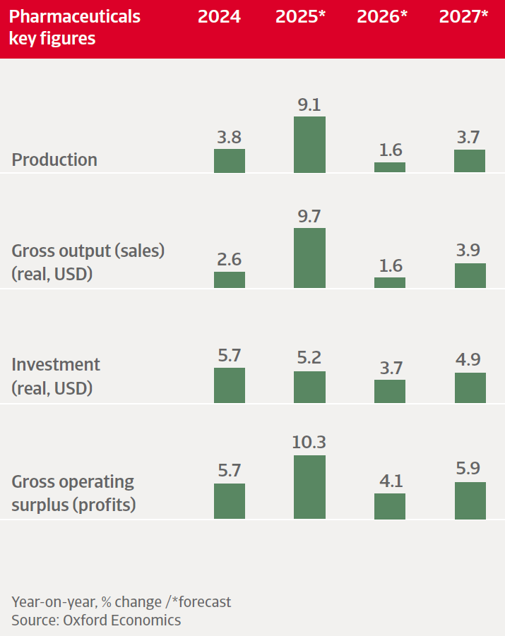• Global pharmaceutical production increased 9.1% in 2025, mainly due to front-loading activity in anticipation of US tariffs